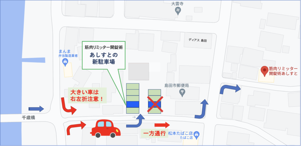 ③ 道なりに100m直進すると、筋肉リミッター開錠術あしすとが見えてきます。