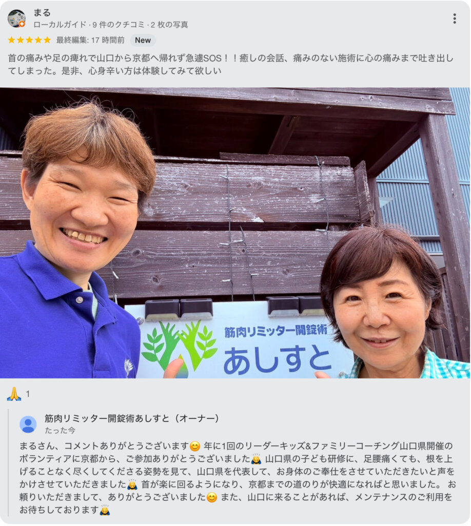 ◎京都から、山口県で開催された「リーダーキッズ」のボランティアに参加されてて、京都に帰る前に首の痛みや足のしびれのお悩み解決に貢献させて頂いたり。
